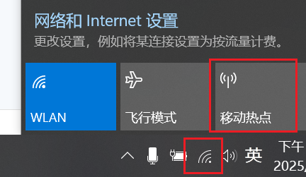 点击右下角的WiFi图标,然后点击移动热点进行开启,首次开启注意设置你的连接密码