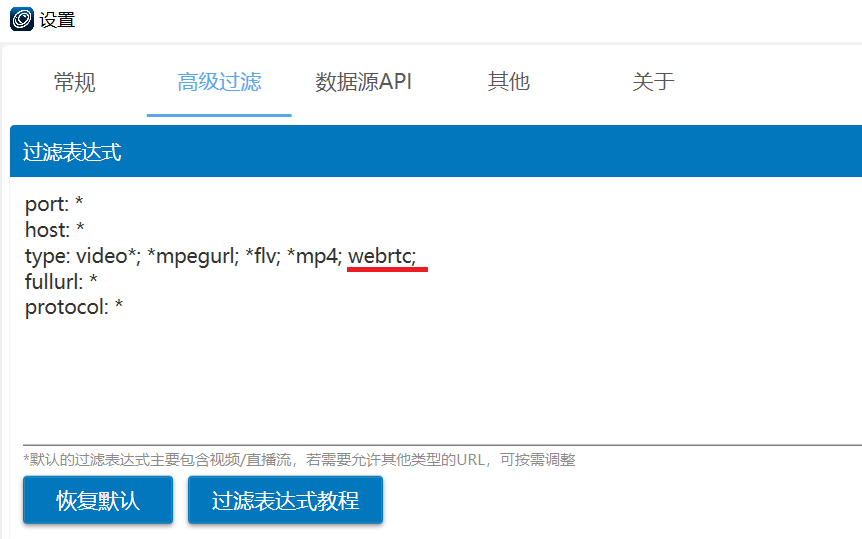 确认过滤表达式允许WebRTC协议类型,如果没有请手动添加webrtc,每个类型使用英文输入法分号分隔,应该如下所示: