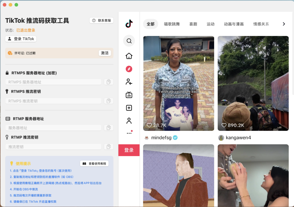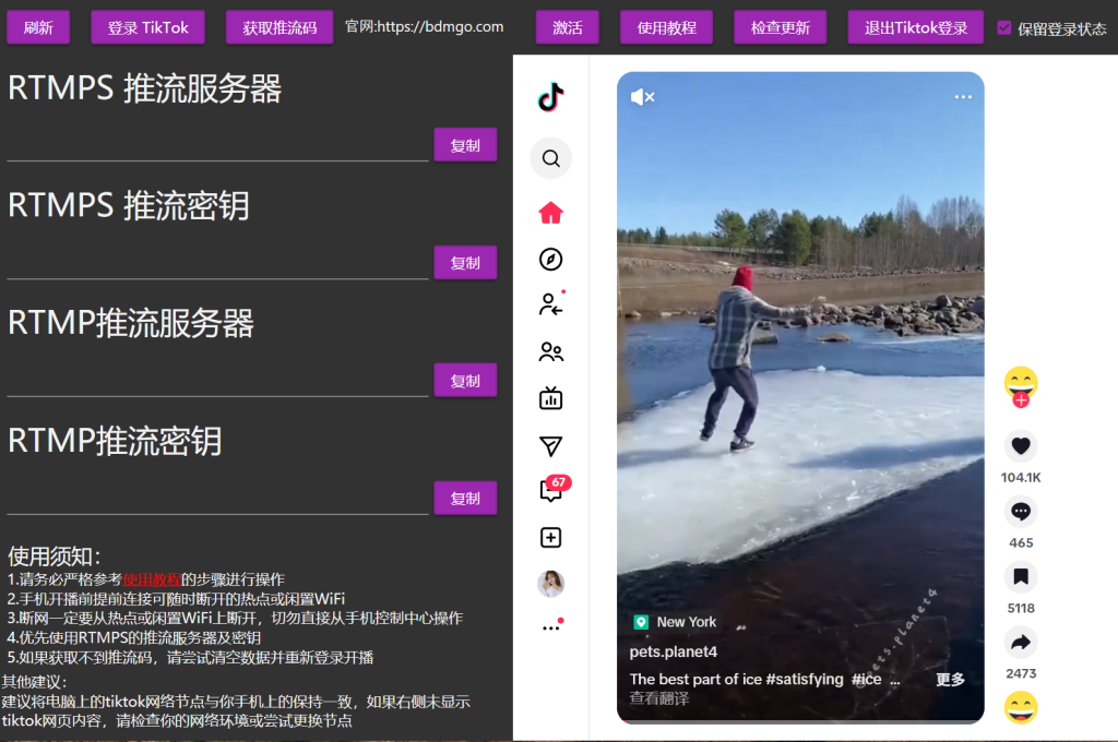 一款tiktok 推流码获取工具,方便你在任意支持推流的地方使用。请注意,使用此工具你需要具备足够稳定的网络环境,否则你可能无法获取有效结果,足够稳定的网络环境也有助于你推流顺利,详情请查看使用教程